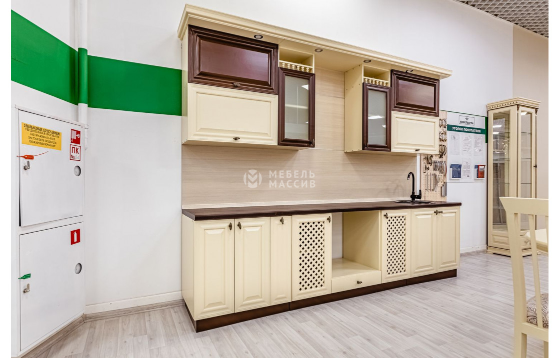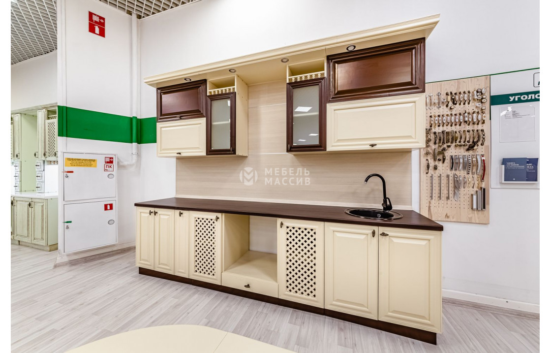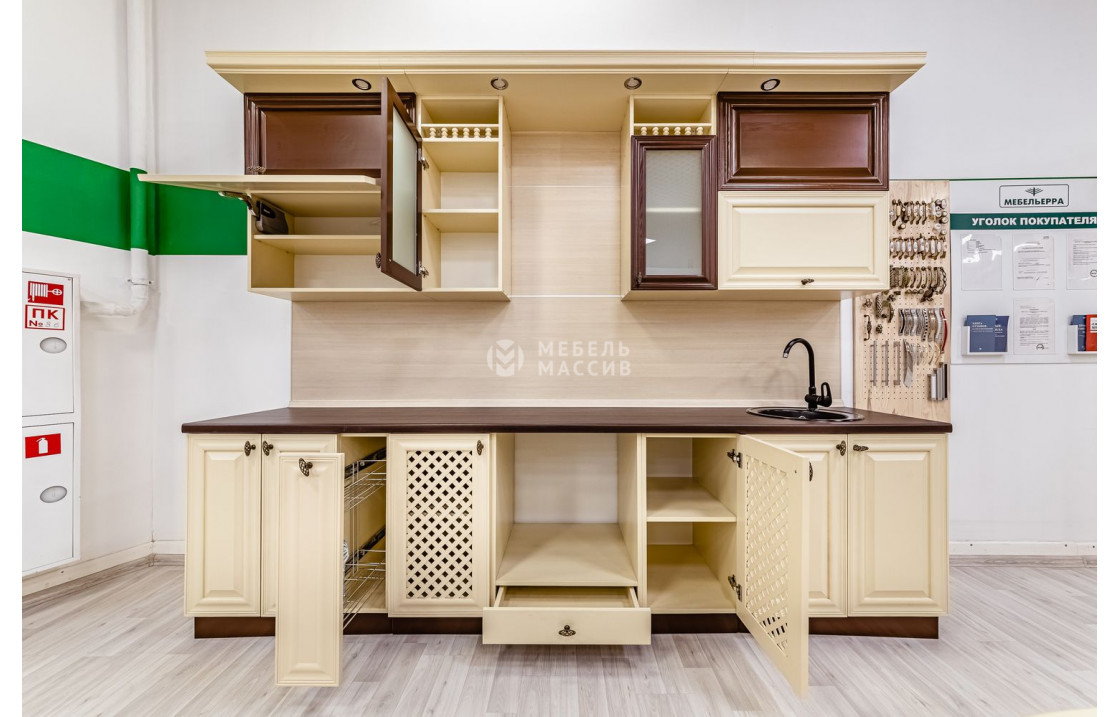 Вместительная Кухня Валерия (слоновая кость + коричневая эмаль) из сосны или берёзы имеет множество отделений для хранения кухонных принадлежностей. Она включает в себя изящные шкафчики, аккуратные ящики и полки. Вы сможете купить комплект по лучшей цене.| Материал | сосна |