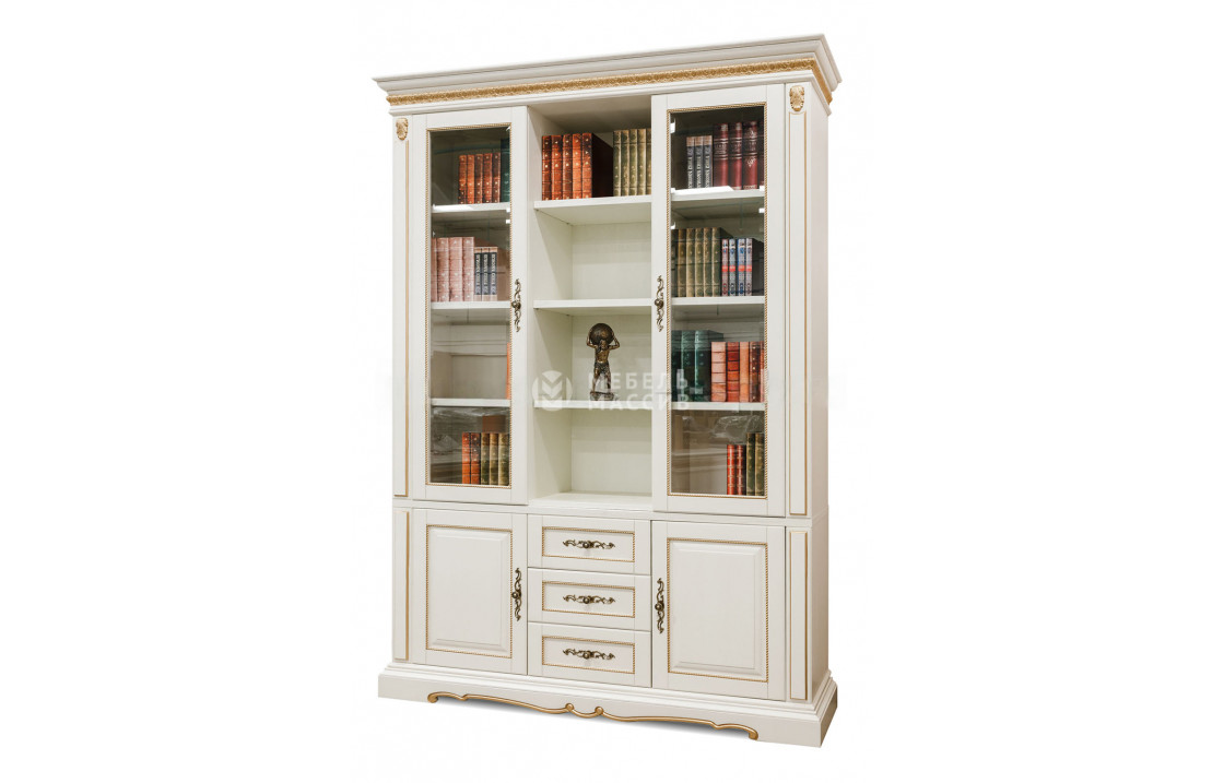 Библиотека Милано из массива сосны – шкаф премиум-класса с классическим дизайном. Он предназначен для хранения книг и различных печатных изданий в гостиной или кабинете. Внутреннее пространство модели предусматривает наличие открытой центральной полки, две боковых стеклянных створки, на которых также имеются полки, а также отделения за монолитными дверцами и выдвижные ящики на направляющих. На выбор покупателя есть почти два десятка цветов поверхности и множество вариантов ручек, это можно подобрать по вкусу при совершении заказа.